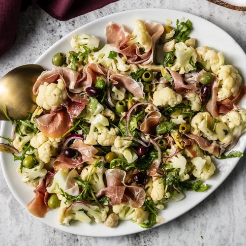 Classic antipasto doesn’t exactly work on AIP. It’s traditionally full of nightshades, aged cheese, cured meats—none of it’s compliant. But that wasn’t stopping me from wanting to pick at a pile of prosciutto, olives and artichoke hearts marinated in herby, red wine vinaigrette. And since antipasto is more of a concept than a recipe, why not trade in all the things that are off limits for delicious things that are AIP-friendly? Like cauliflower, which lays the foundation for this AIP antipasto grazing board. Make it for entertaining, or just for yourself as a lunch and dinner salad that just gets better in the fridge as it sits. This briny-tangy-salty-crunchy platter of antipasto that’s all about picking a little of this, a little of that. Toss it all together in a giant scoopable salad, or give the ingredients their own spot over a platter of peppery arugula.