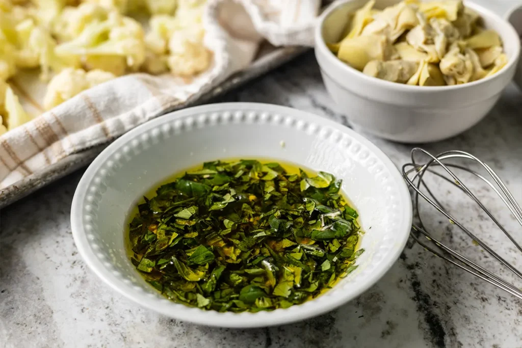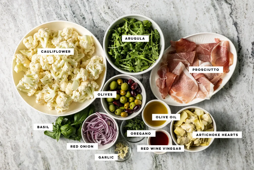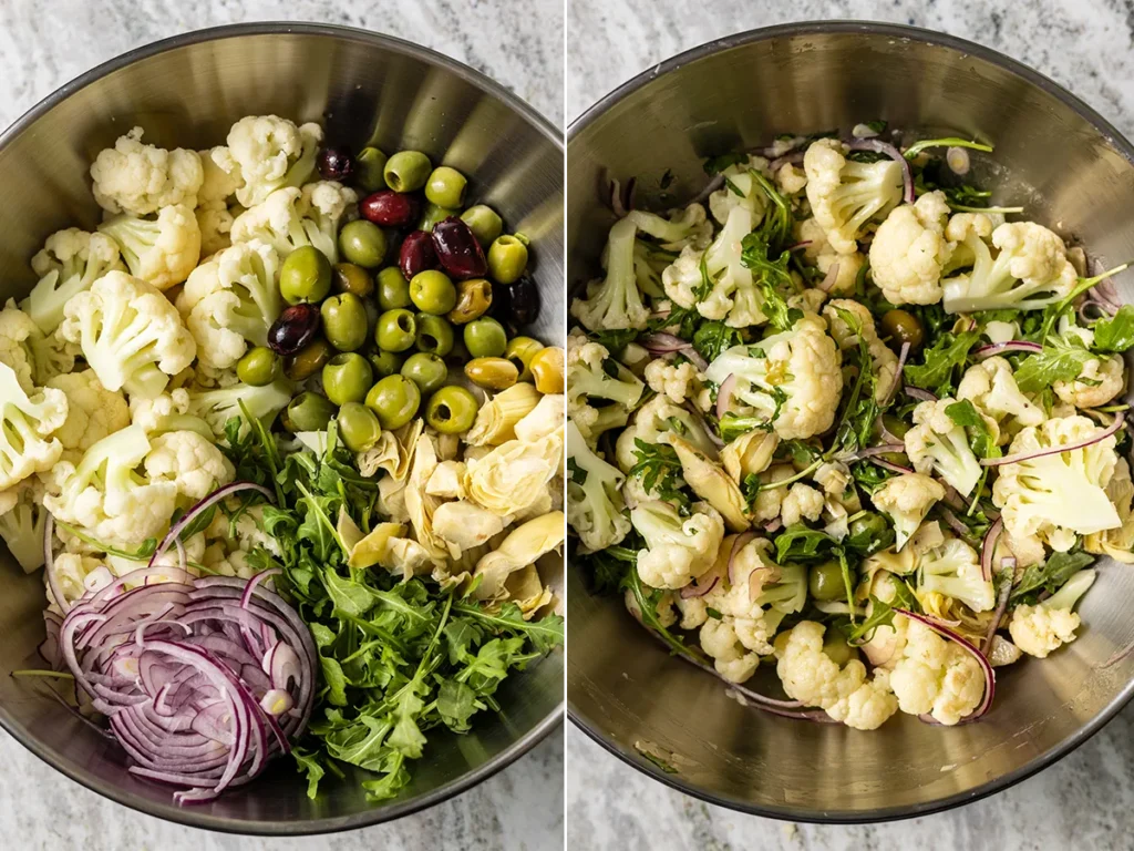 Then, toss the cauliflower, olives, artichoke hearts, onions and arugula with the dressing. Cover and chill for at least 30 minutes.