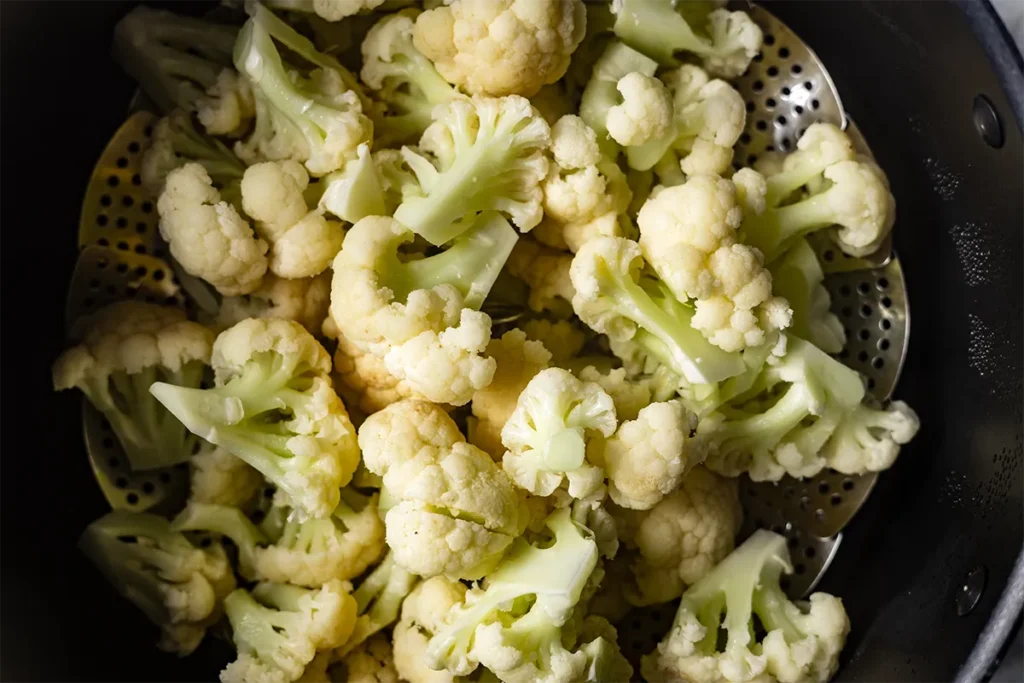 - Nestle a steamer basket inside the stockpot and pile in the cauliflower florets, seasoning them with a pinch of salt. Cover and steam just until the cauliflower is tender but still retains a hint of toothsome bite, about three to five minutes.