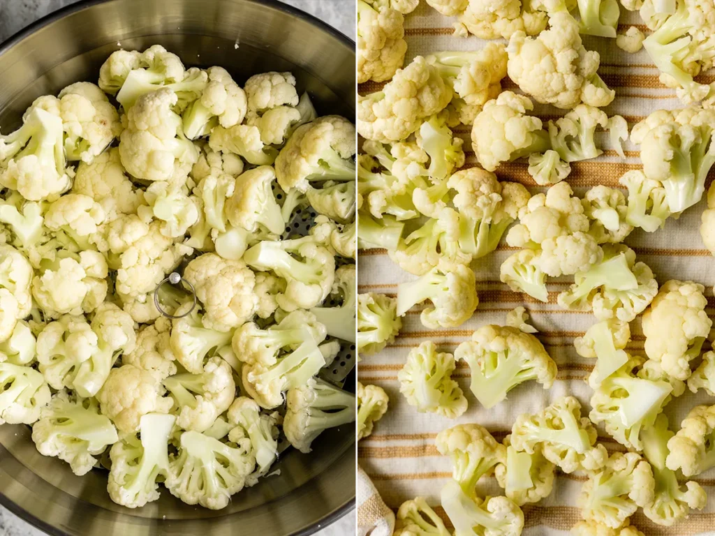As soon as the cauliflower is cooked, spoon the florets into a large bowl of ice water to shock them and immediately halt the cooking. Allow them to cool in the ice bath for a minute or two, then dry them on a towel-lined baking sheet and pat them fully dry.