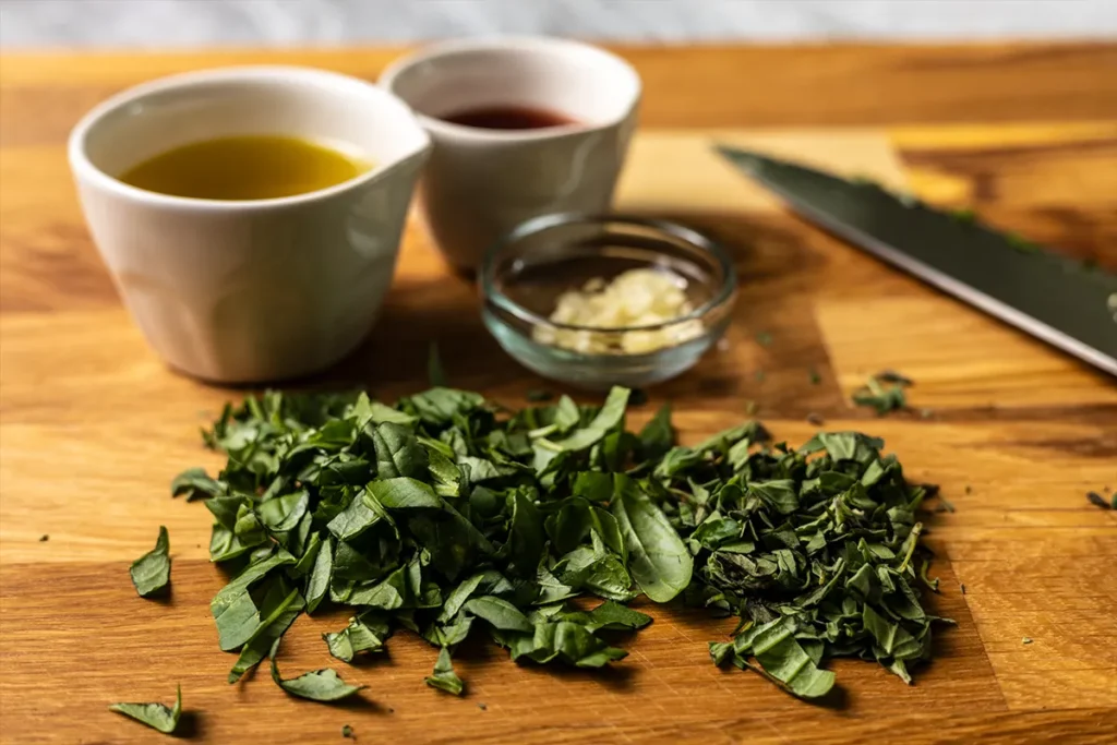 Red wine vinegar is your classic red-checkered-tablecloth Italian restaurant vibe for this dressing. But don’t miss out on the chance to upgrade it with really good quality, fruity Extra Virgin Olive Oil and fresh – not dried – herbs. Finely chop fresh oregano and fresh basil. You could add in some parsley if you have it in your fridge, as well. Just aim for about a quarter-cup of fresh herbs in total. If you’ve never used fresh oregano before, you might be surprised that it has a citrusy and woody flavor that’s not as heavy or overpowering as its dried counterpart.