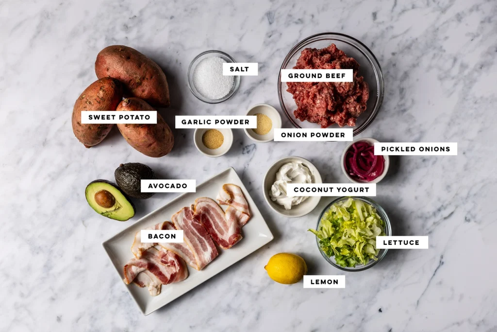 Sweet potatoes were one of the first comfort foods I leaned on when I started the Autoimmune Protocol, and this bacon burger stuffed sweet potato quickly became one of my favorite AIP dinners. This version is designed for classic AIP Core, so it’s nightshade-free, dairy-free and free of seed spices, too. The magic is in a few easy little touches that go the distance for flavor: I coat the sweet potatoes in salt before roasting so the skins get irresistibly crisp, whip up a quick avocado crema (mayo and dairy? don’t need ’em…), and season the burger meat with garlic and onion before browning it until you get those crispy, craggy edges that are the best part of any burger. Add your favorite AIP-compliant bacon and a tangle of my homemade pickled red onions on top, and you’ve got an AIP sweet potato dinner that feels like a treat but still plays by all the rules.