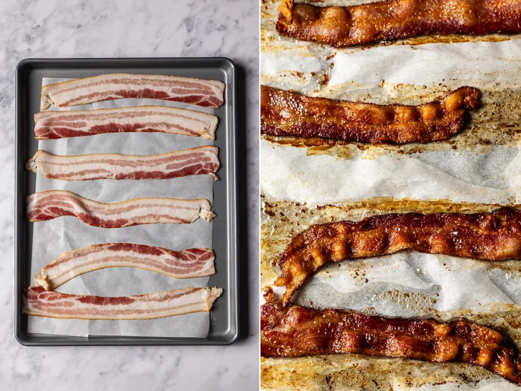 - Arrange the bacon on a parchment-lined sheet pan and roast alongside the sweet potatoes until the bacon is crisp, 8 to 10 minutes. Transfer the bacon to a paper towel–lined plate and let cool, then dice or crumble.