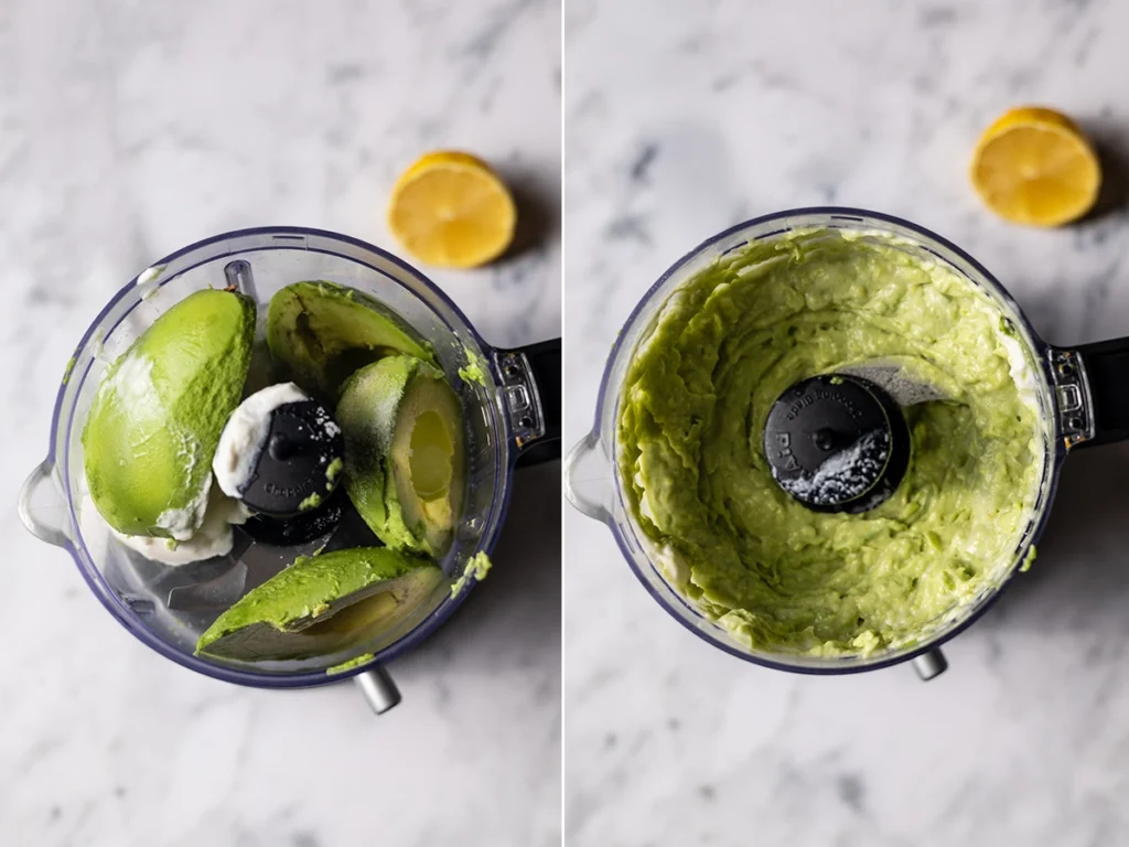 - Make the avocado crema: mash the avocados with the coconut yogurt, lemon juice, and a pinch of salt (or blend in a small food processor) until smooth.