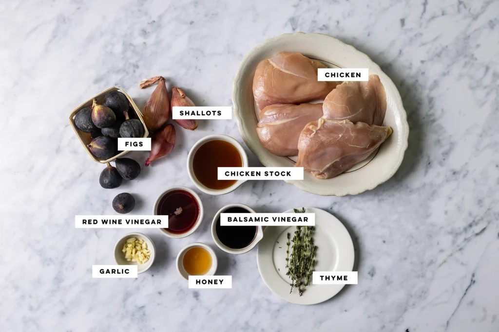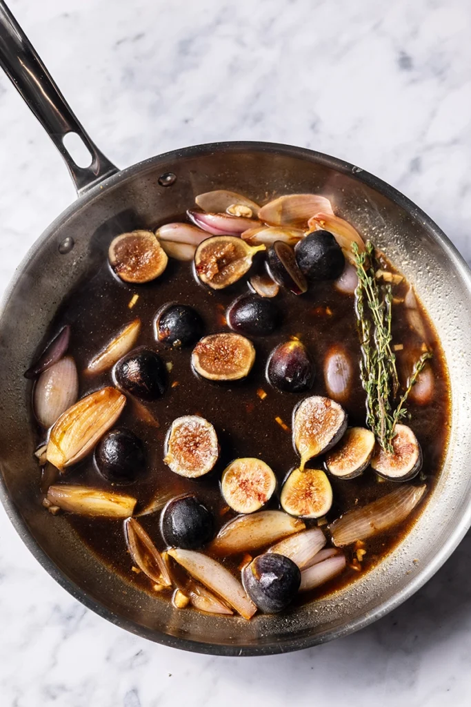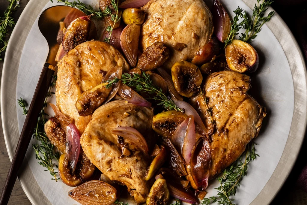 Chicken simmers in a glossy reduction of balsamic and red wine vinegars with caramelized shallots and fresh sweet figs.