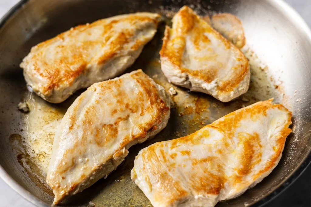 Season the chicken generously with salt and brown it on one side, letting it sit undisturbed for about 3 to 5 minutes. Then, flip the chicken over and cook on the other side for just about a minute or so before transferring the chicken to a plate. The chicken will finish cooking in the sauce in a later step.