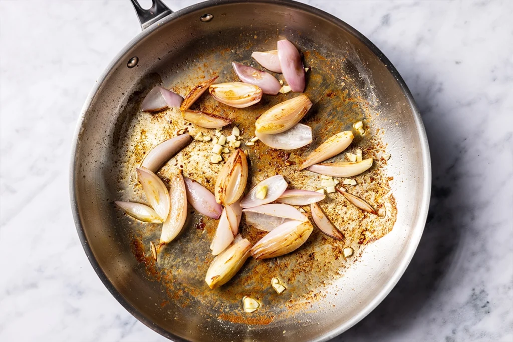 • Add the remaining tablespoon of oil to the skillet. Add the shallots and cook, turning occasionally, until browned and caramelized, about 3 minutes. Reduce the heat if they brown too quickly. Stir in the garlic and cook for 1 minute more.