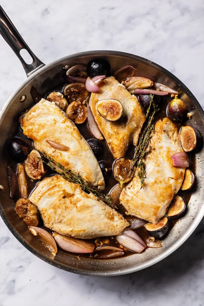 • Transfer the chicken to a platter and spoon the figs and shallots over top. Discard the thyme. Simmer the sauce 1–2 minutes more if you’d like it thicker, then taste and adjust seasoning. Pour the sauce over the chicken and serve warm.