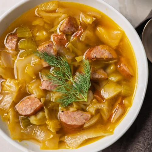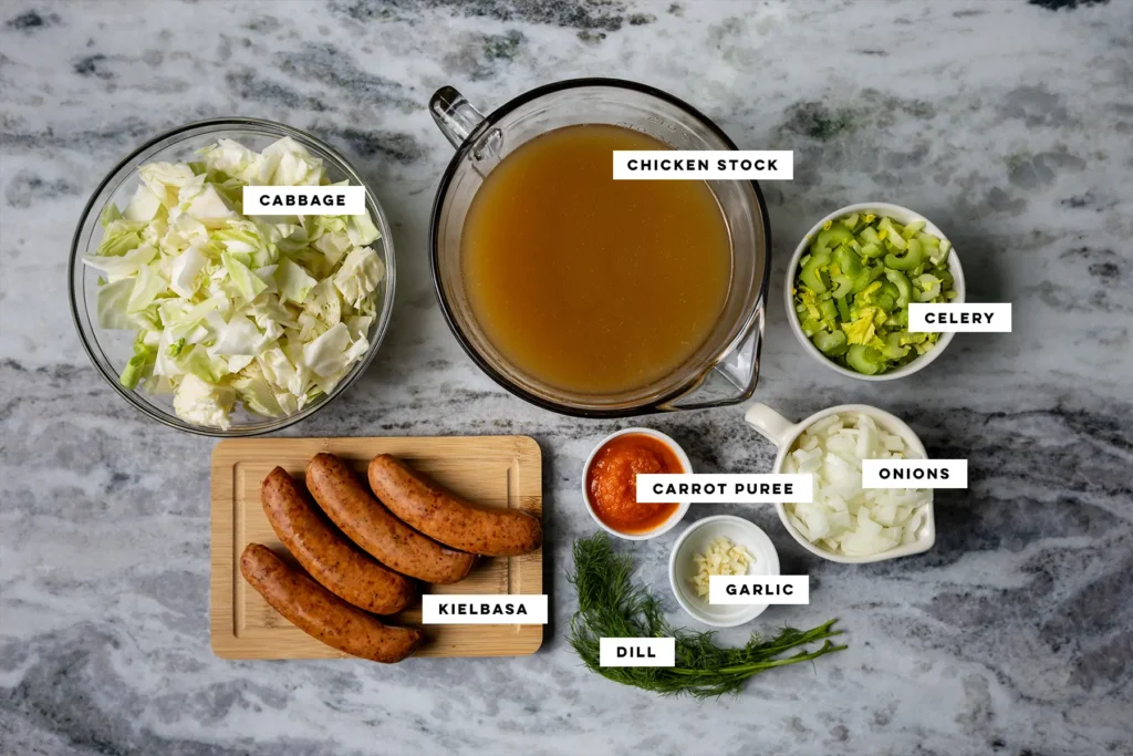 This cabbage soup without tomatoes was created for chilly days when you want a rich, savory bowl of soup but can’t do nightshades. Instead of tomato paste or tomato sauce, a simple carrot purée (that’s straight from a jar) enriches the broth with color, body, and a gentle sweetness that works surprisingly well with cabbage and smoky kielbasa. As it simmers, the cabbage softens and turns sweet, and the whole pot becomes bigger and more satisfying than the sum of its humble parts.