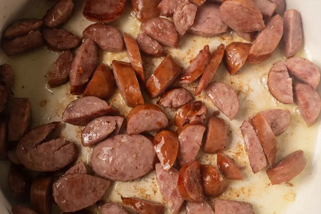 - Heat oil in a large Dutch oven or stock pot over medium high heat and brown the kielbasa on both sides.