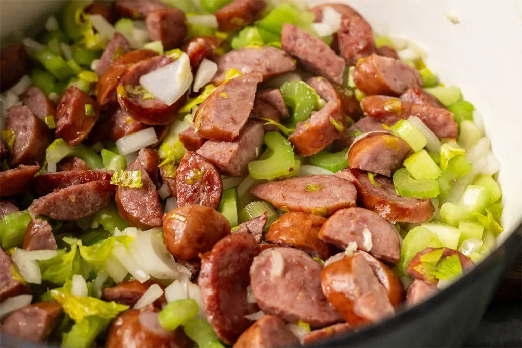 Cut the kielbasa links lengthwise and then into half-inch slices. Heat olive oil over medium high heat in a Dutch oven or stock pot and arrange the kielbasa cut side down. It will begin to brown quickly. Turn it over to caramelize on all sides.