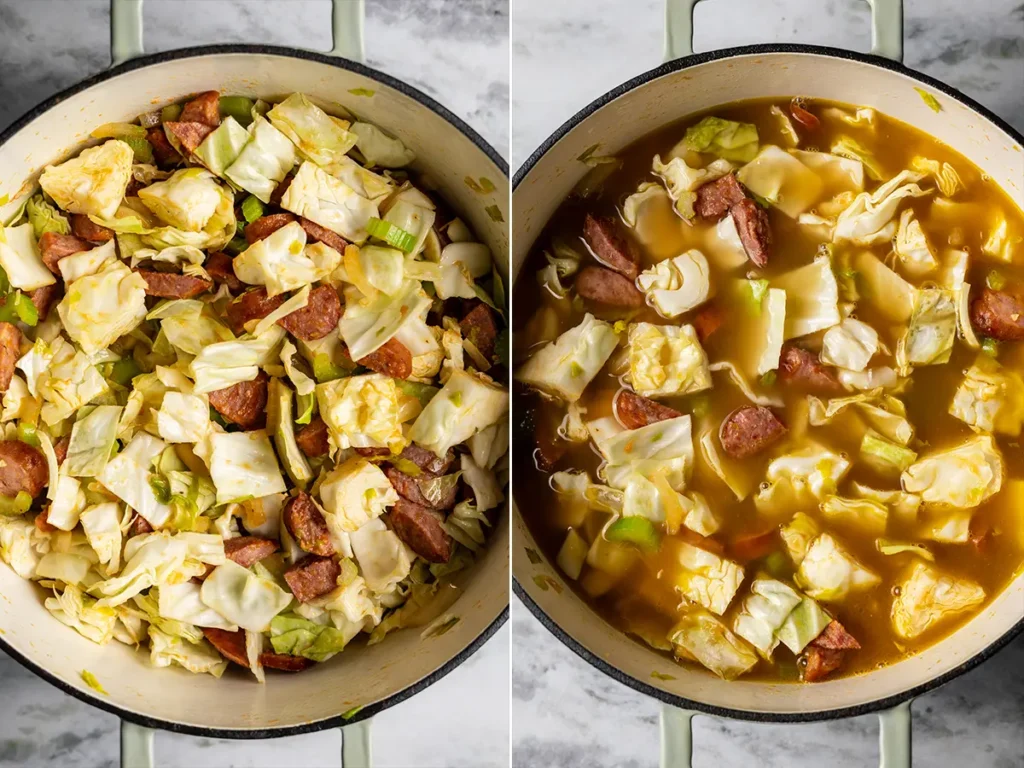 - Cover and simmer for 15 minutes, then uncover and cook at a simmer until the cabbage is completely cooked through and tender.