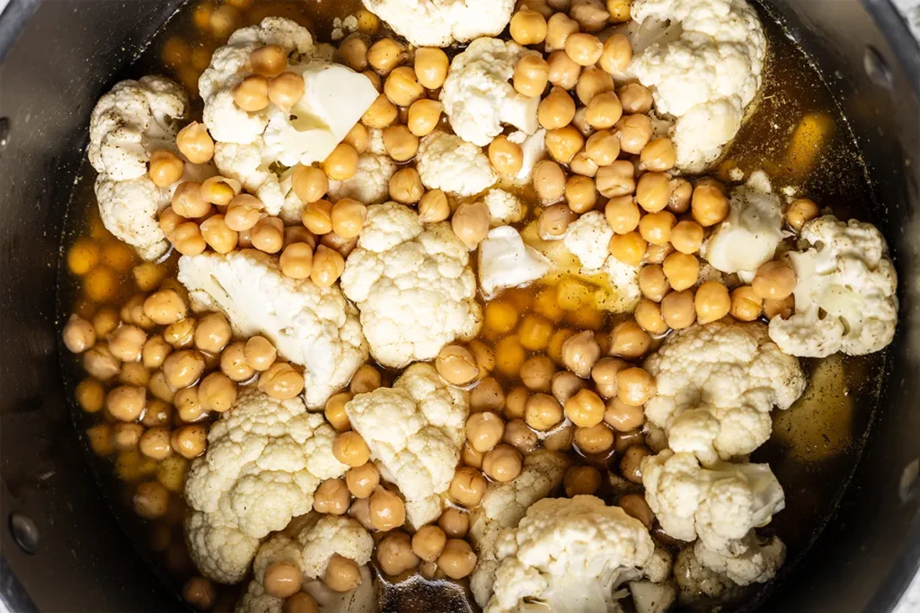 - Add the cauliflower, reserved two cups of chickpeas and remaining 1½ teaspoons of za’atar seasoning. Pour in enough chicken stock to just barely cover the cauliflower, reserving extra to adjust consistency later.
