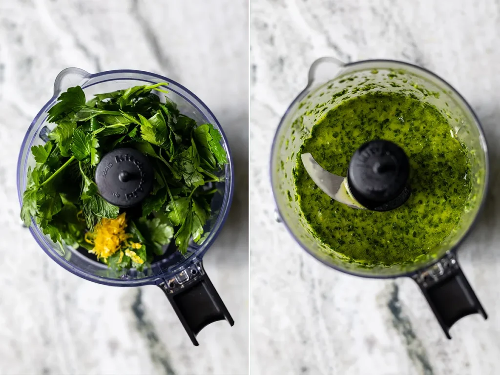 - In a food processor, blend the herbs, lemon zest, ½ tsp kosher salt, and ⅓ cup olive oil until finely chopped. Adjust seasoning and set aside for topping.