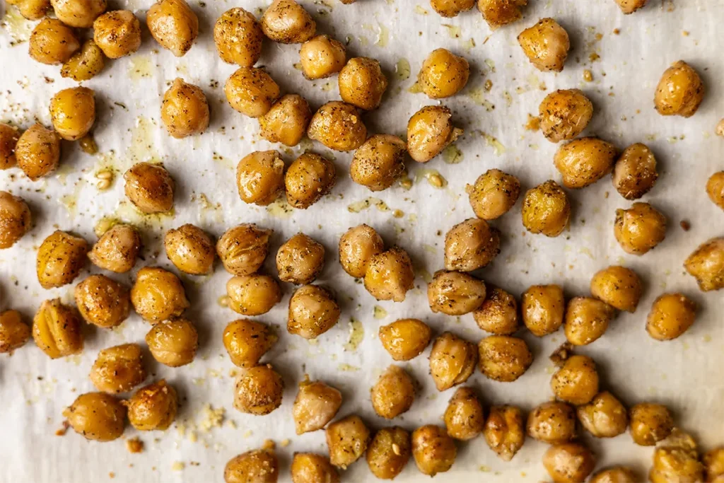 - Drain and rinse two cans of chickpeas, reserving 2 cups. Toss the rest with 1 tablespoon of olive oil, ½ teaspoon of za’atar, and a pinch of salt. Roast on a prepared baking sheet for 15 minutes, until browned and popping. Set aside for topping.