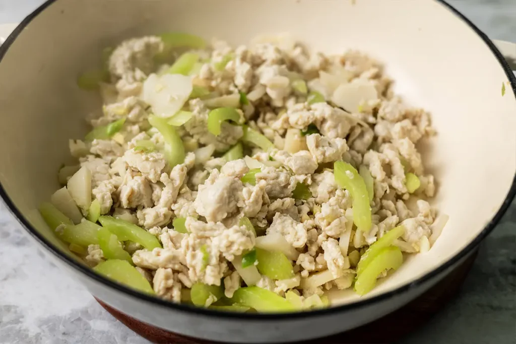 - Add the celery, water chestnuts, ginger, and the sliced white ends of the scallions to the skillet along with an additional pinch of salt. Cook for 1 to 2 minutes, stirring occasionally, until the chicken is fully cooked and the vegetables start to soften.