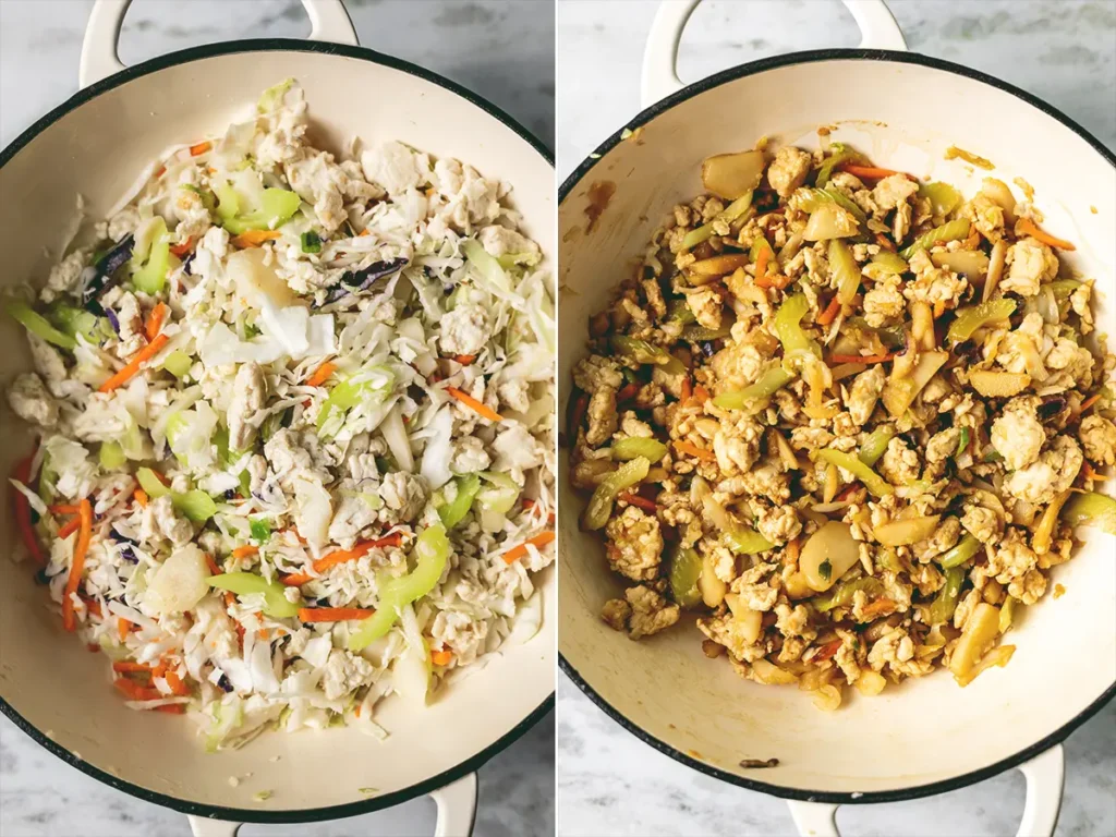 Heat one tablespoon of olive oil or avocado oil over medium high heat. Add the ground chicken and begin breaking it up with a spatula. Then, add in the celery, white bulb ends of the scallions, water chestnuts and grated ginger. Once the chicken is cooked through, add the garlic and sauté until it’s just fragrant, about one minute more.