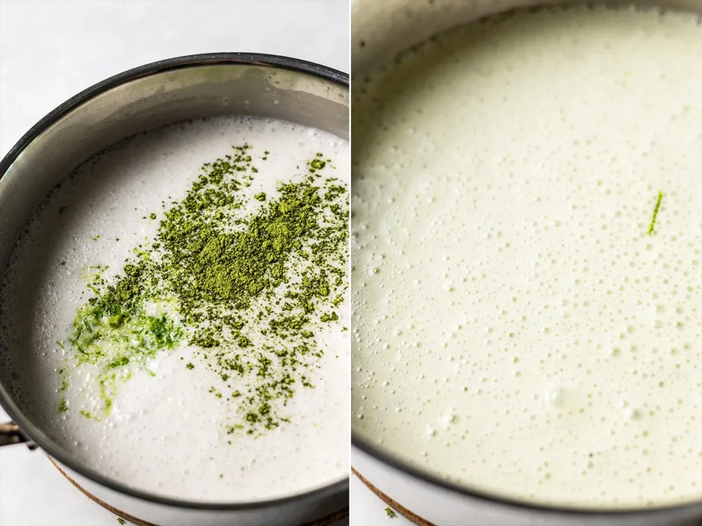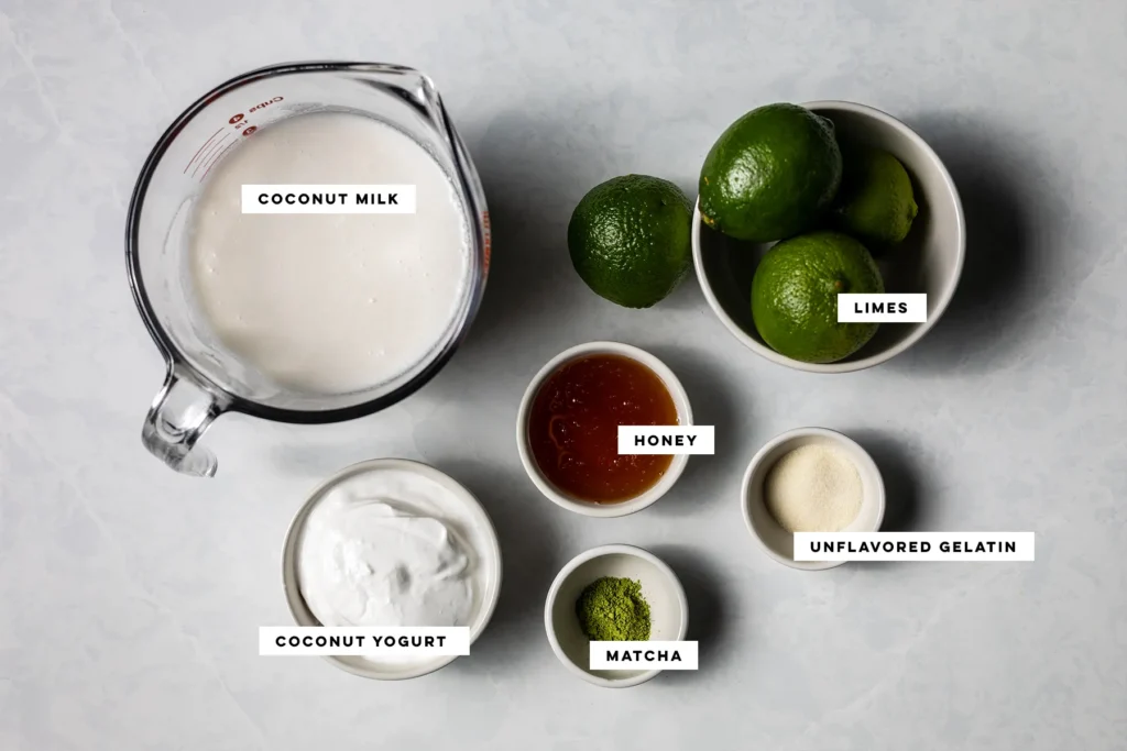 - Once the gelatin has moistened, gently warm the coconut milk over low heat, stirring occasionally, just until the gelatin dissolves. Whisk in the coconut yogurt, honey, matcha powder, lime juice and salt.