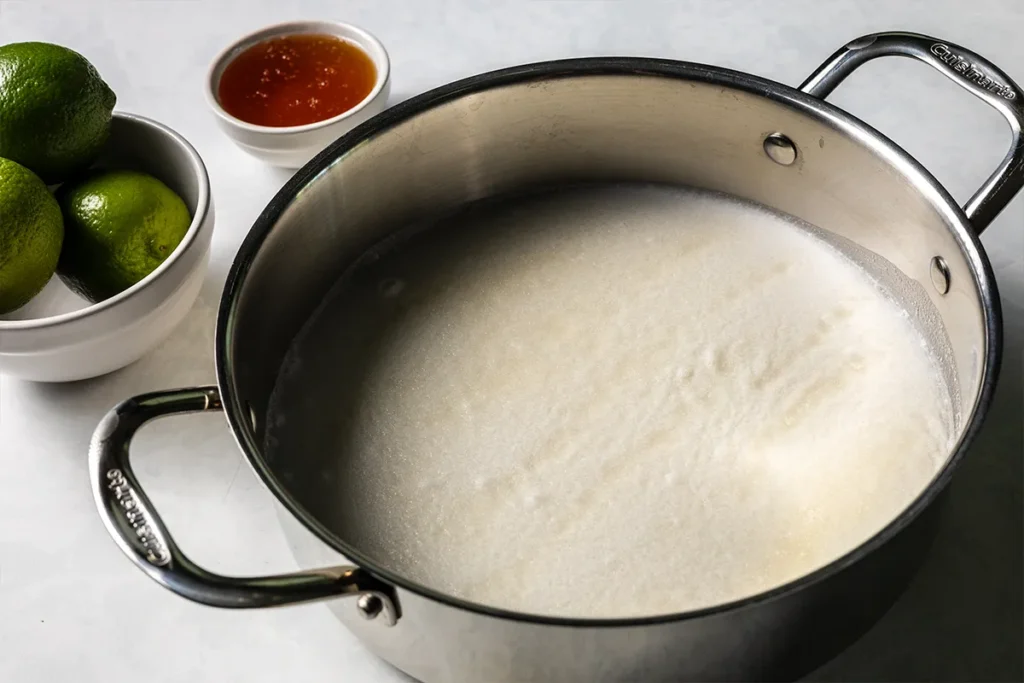 - Keep the mixture just below a simmer and let it steep for 3 to 5 minutes, stirring regularly. Then, remove from the heat and stir in the lime zest.