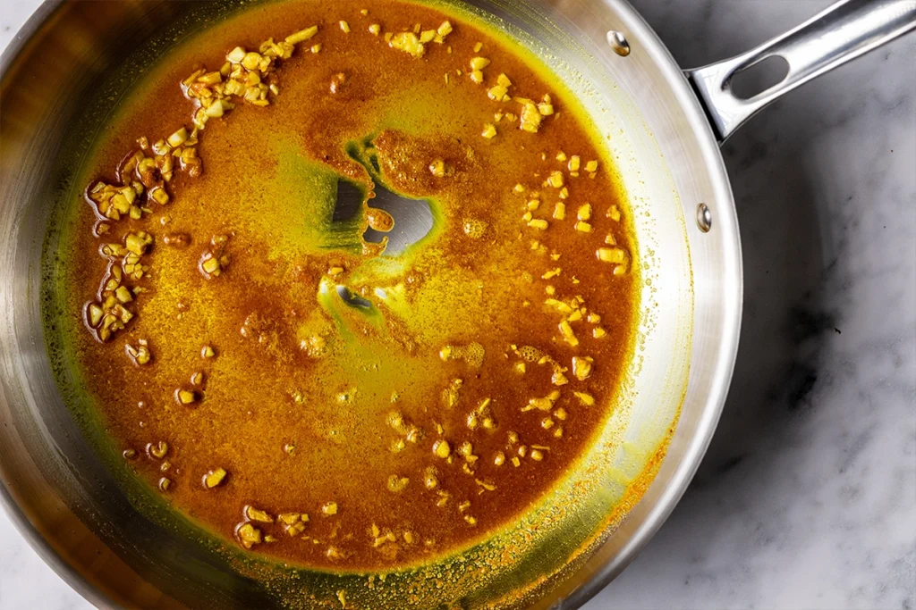 - Heat the oil in a large sauté pan over medium heat. Add the garlic and cook until soft and fragrant, 1 to 2 minutes. Add the turmeric, ginger, onion and mace or nutmeg, stirring to coat in the oil, and cook until the spices are toasted and aromatic, about 30 seconds. Add the fish sauce or coconut aminos and stir to combine.