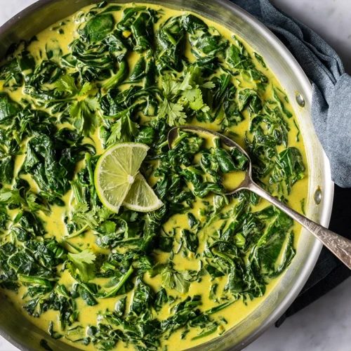 Just before serving, squeeze a bit of lime juice over the top to bring some brightness to the coconut curry, then finish with fresh cilantro. This dairy-free creamed spinach is a simple shift from cream to coconut, and that swap turns this into something so much more rich and flavorful, and even a little unexpected.
