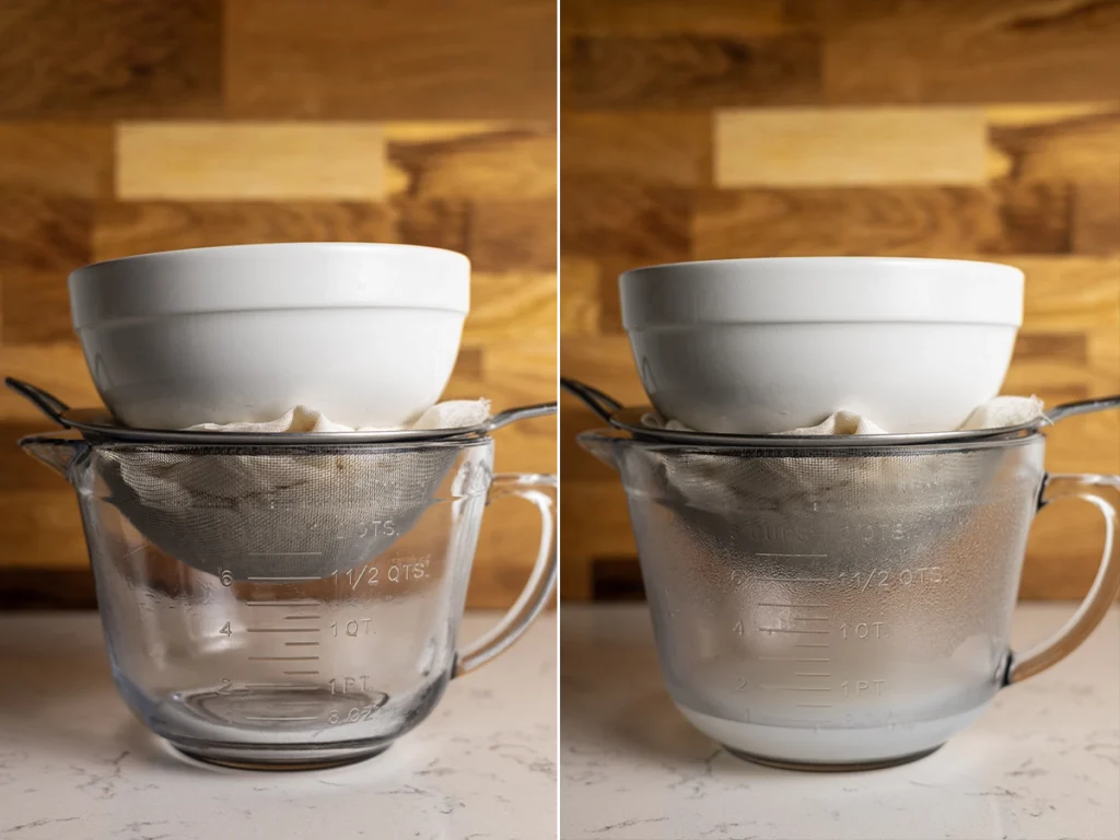 - Refrigerate for at least six hours to allow the liquid to drain. When ready, lift the strainer from the bowl and pour off the liquid.