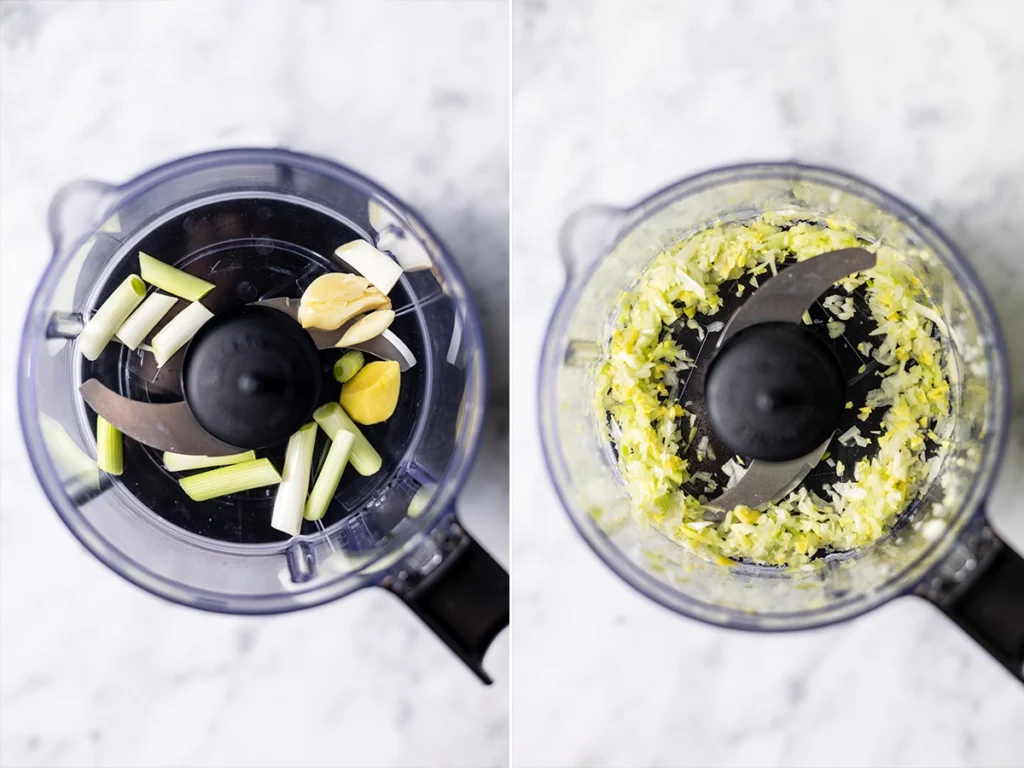 • Add the garlic, ginger and white scallion bulbs to a food processor and pulse until finely chopped.