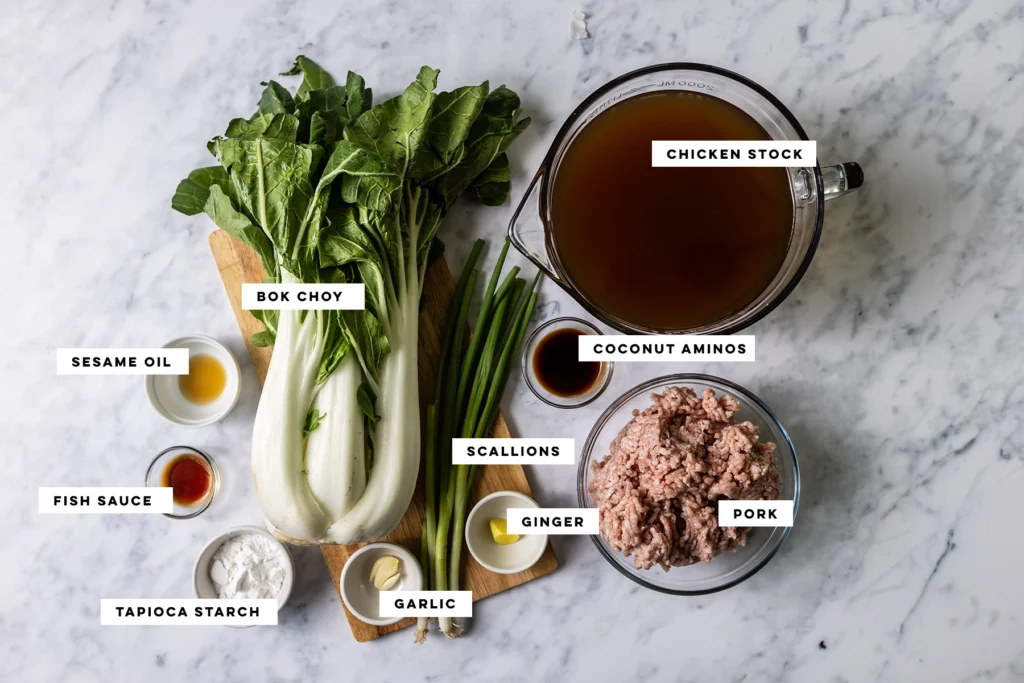 Gluten-Free Wonton Soup keeps the best part of the classic — the savory filling — and skips the wrapper altogether. Instead of folding pork and shrimp into delicate dumplings, this version turns that same ginger-garlic filling into tender meatballs that simmer gently in a clear, nourishing broth with bok choy and scallions. A little tapioca starch keeps the meatballs light and springy, so you still get that signature wonton texture without any gluten, soy or fillers. It’s weeknight-friendly, deeply comforting, and tastes like takeout, just better for you.