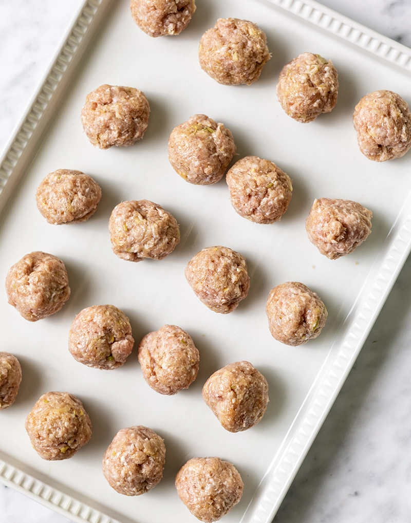 • Add the ground pork and mix until fully combined, then roll into approximately two dozen 1-inch meatballs.
