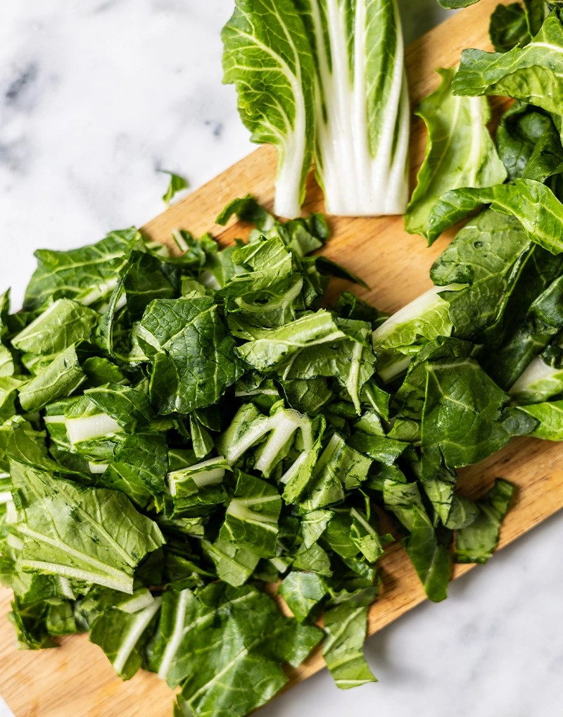 • If using baby bok choy, chop both the leaves and tender stems. If using mature bok choy, chop only the leafy green tops and reserve the thicker white stems for another use.