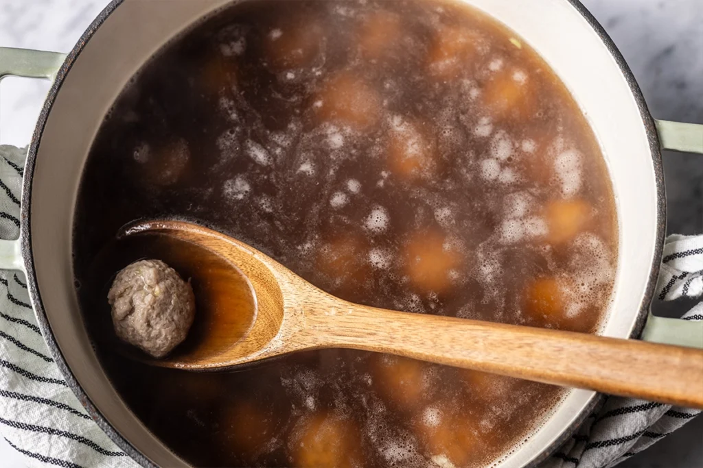 • Carefully drop the meatballs into the simmering chicken stock and cook for 2 to 3 minutes.