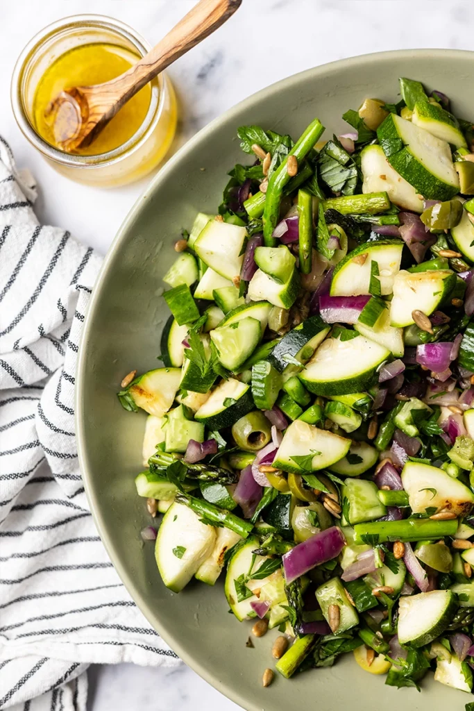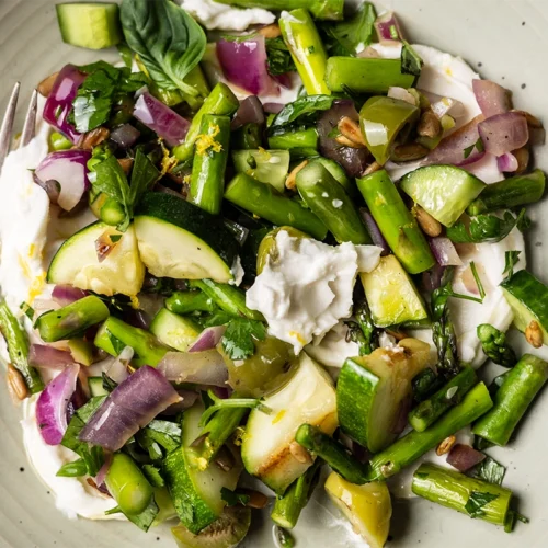 This Grilled Vegetable Salad is anything but lettuce-in-a-bowl, and it may completely change how you think about salad. A quick sear on a hot grill transforms summer vegetables like zucchini, asparagus and red onion into something richer. They’re smoky and just a little charred, while still keeping that satisfying crunch. Paired with crisp cucumbers and briny Castelvetrano olives, every bite is a contrast of warm and cool, soft and snappy, bright and savory. I love serving it over a swoosh of my dairy-free labneh (made from coconut yogurt), which turns the lemony dressing into something creamy and light. AIP Modified, Paleo and Whole30 eaters, this one’s for you. And it comes together fast, since the grill isn’t for heavy lifting here, just a quick turn to bring out summer’s best.