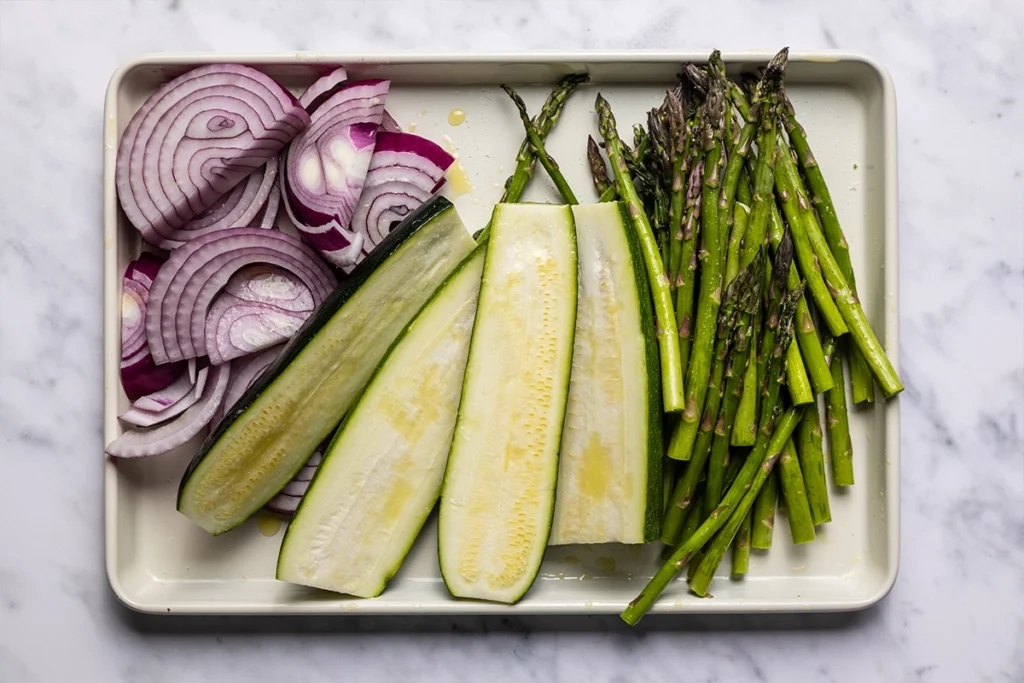 Start by prepping the veggies. Cut the ends from two zucchini and slice them in half lengthwise. Then cut the woody ends off a bunch of asparagus and slice a medium onion into half-inch rounds or half-rounds. Toss everything with a tablespoon of olive oil and season generously with salt.