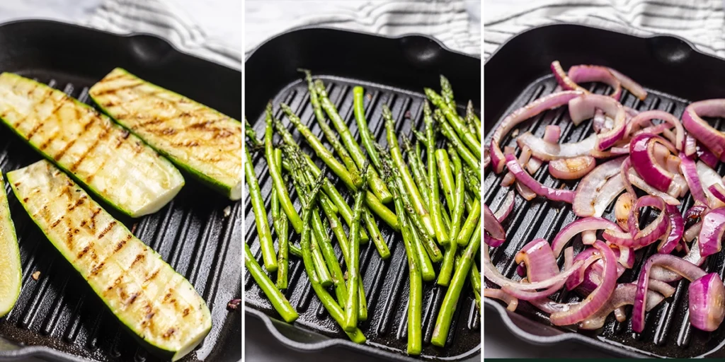 You can grill the vegetables on the stove using an indoor cast-iron grill pan or take the grill pan outside to a traditional outdoor grill. If you’re using an outdoor grill, you’ll want the pan to make sure that the vegetables don’t slip through the grates. Heat the cast-iron grill over high heat and sear the vegetables until they are charred on the outside but still firm. The asparagus will turn bright green, the onions will begin to soften and the zucchini will get dark grill marks but still be toothsome and crunchy. I’ve made this many times on an indoor grill and I’m always surprised how the cast iron gives the same smoky charred flavor.