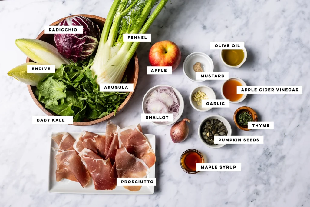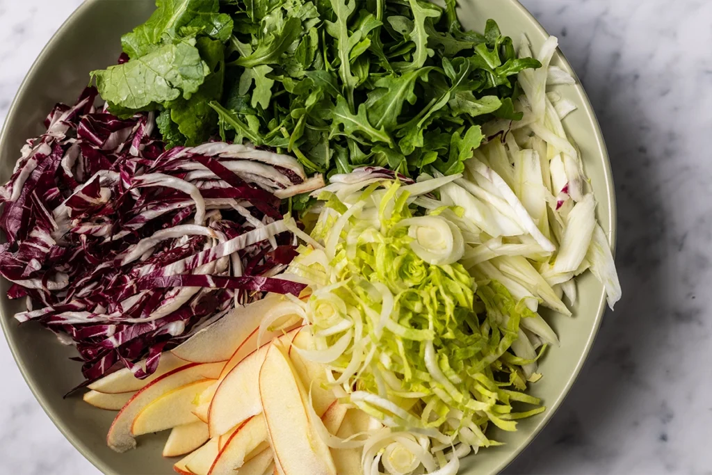 I like to think of this as a shredded salad, almost like a slaw, or even a chopped salad. When you prepare the vegetables, slice them all very thin. You can even opt to shave the fennel bulb with a peeler or on a mandolin for transparent ribbons. The idea is to get as many of the components of the salad in each bite, so chopping small is key. Toss together the radicchio, arugula, endive, baby kale, fennel and apple slices. Keep the apples from browning by holding them in a bowl of water with a squeeze of lemon for a few minutes before tossing in the salad.
