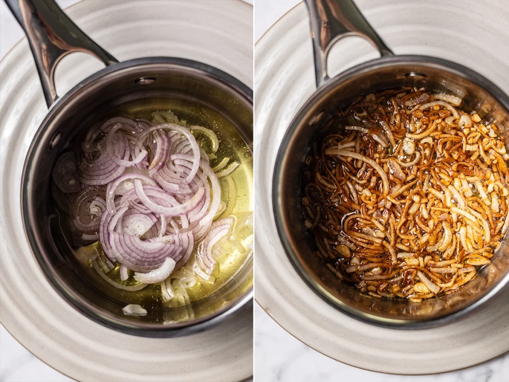 Next, make the frizzled shallots. Warm avocado oil in a small high-sided saucepan over medium-high heat. Aim for about a half-inch of oil in the pan for a very shallow fry. Avocado oil works well here because it has a very high smoke point, but we don’t want to nearly bring it up that high. We’re not flash-frying these shallots at high heat. Instead, keep the oil around 225° to 275° where it’s barely bubbling, and let the shallots crisp slowly, around 5 to 7 minutes. Once they start to brown, they’ll burn very quickly, so be ready to remove them with a slotted spoon to a paper towel-lined plate. Then give them a generous pinch of salt.