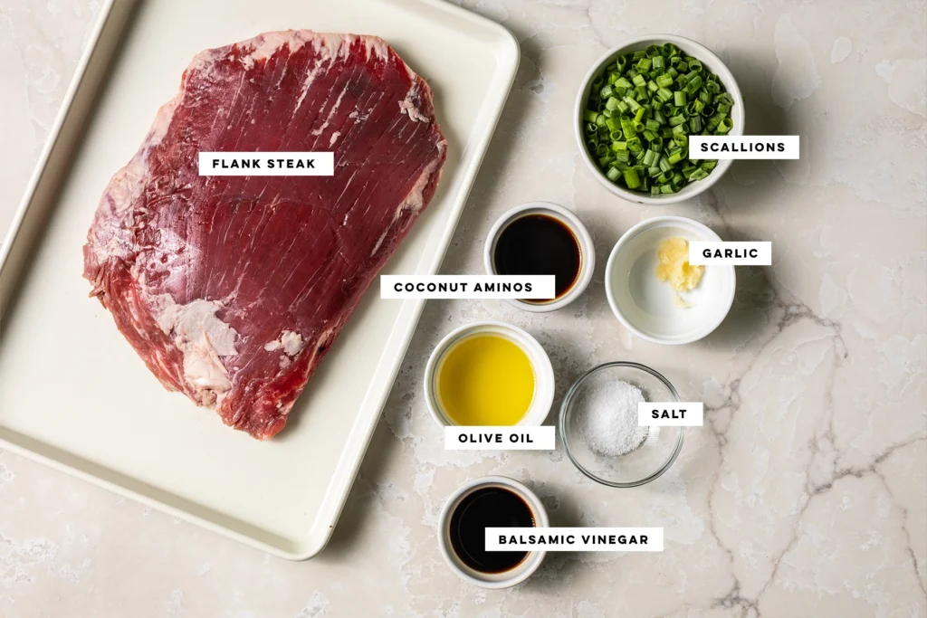 This marinated flank steak is fully compliant with AIP Core, AIP Modified, Paleo and Whole30. Instead of traditional soy sauce, the marinade uses coconut aminos for umami without soy or gluten. Paired with balsamic vinegar and fresh garlic, it’s built around whole, minimally processed ingredients. When possible, choose grass-fed and finished beef for the best flavor and quality.