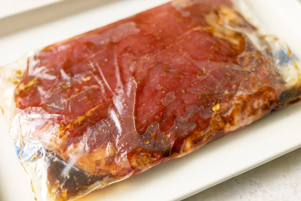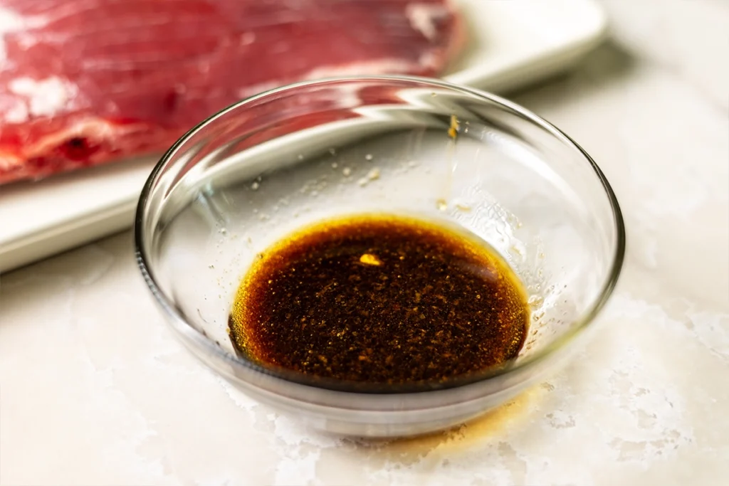 • Pat the flank steak dry with paper towels and place in a glass dish or a large resealable plastic bag.