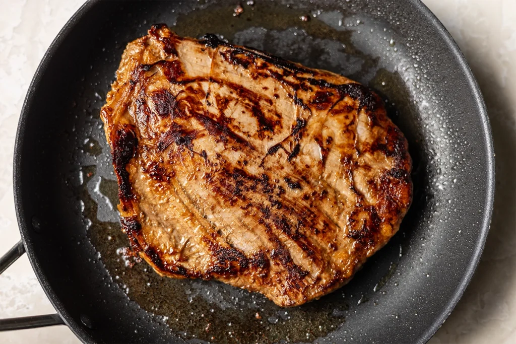 • Heat a very large skillet or cast iron pan over medium-high heat on the stovetop. Add a tablespoon of oil, then add the steak. Discard the marinade.
