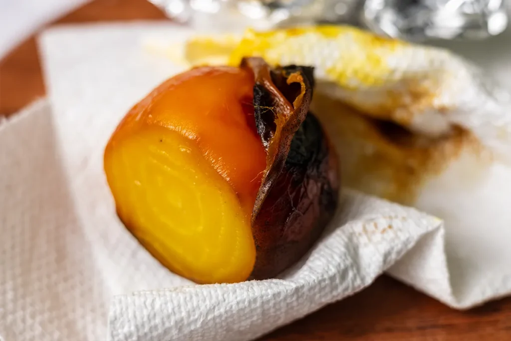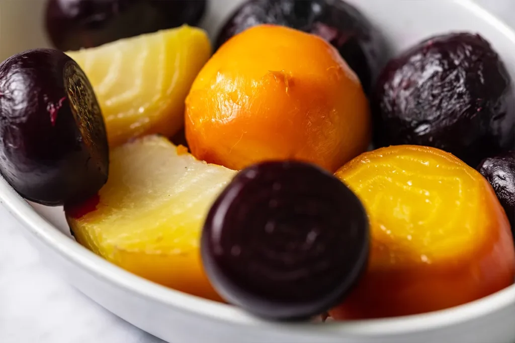 Open the packets and let the beets cool until they’re easy to handle. You’ll be able to easily rub the skins off with a towel or paper towel. Get ready for your fingers to be stained for a bit! Beets have been used as an ancient source of colorful dye for centuries. And they aren’t just red… look for yellow and orange Golden beets and candy cane (or Chioggia) beets that have pink and white circles.