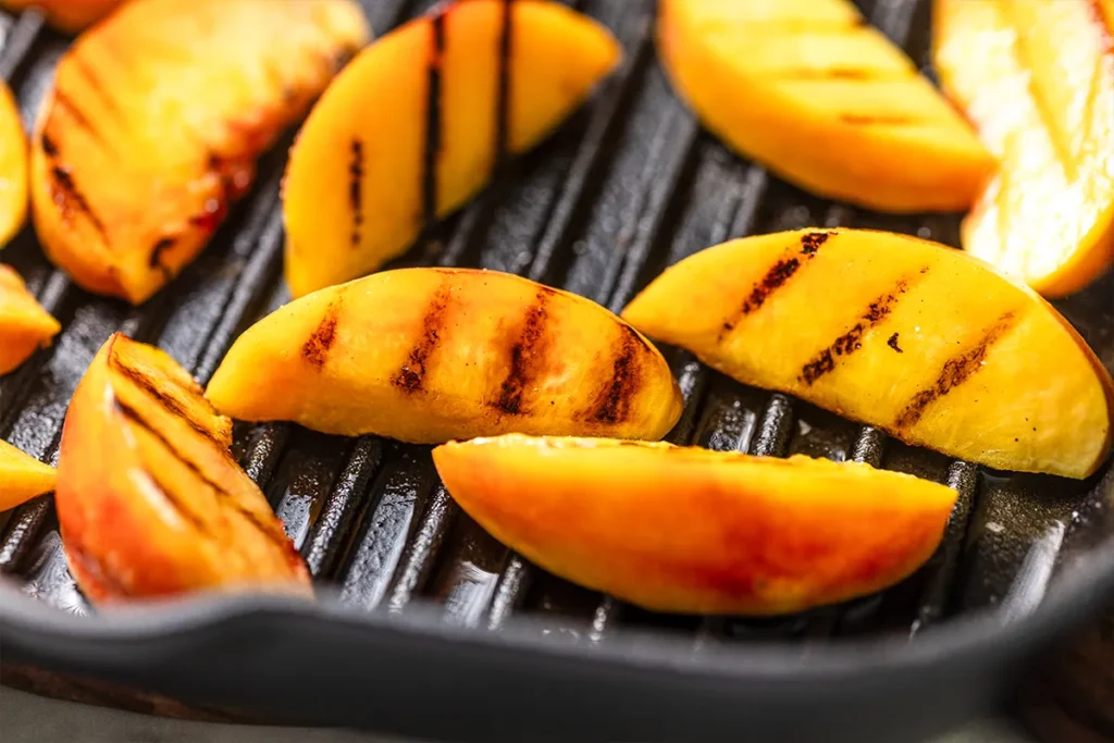 You can use an outdoor grill, but I prefer my trusty cast iron grill pan. Even on the stovetop, they still taste smoky and wood-fired. Sear the peach slices over high heat for about one minute for each side.