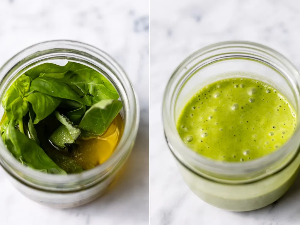 Lastly, make the dressing. This is a dairy-free honey and citrus vinaigrette with lots of basil. Combine a quarter cup of freshly squeezed orange juice and two tablespoons of lemon juice with olive oil, honey, a big clove of garlic and lots of basil leaves. Use a blender, food processor or an immersion blender to puree and emulsify the dressing. The honey and garlic are natural emulsifiers, which means they’ll work to hold the oil and the citrus juices together. If the dressing sits in the fridge for a bit, it will separate somewhat. Just give it a good stir or shake to recombine.