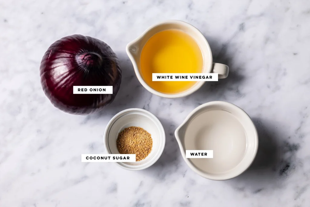 In a small saucepan, heat the water and white wine vinegar until it comes to a simmer. Stir in the coconut sugar and stir until dissolved. Add the thinly sliced red onions to a heat-safe jar or container and pour the warm brine over until the onions are completely covered. It can help to add a pickle weight to the top, or just press down until every onion is in contact with the brine.