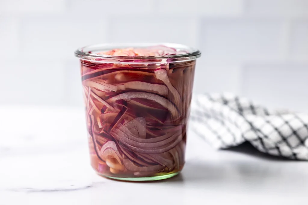 • Add the sliced red onions to a heat-safe jar or small bowl, then pour the brine over.