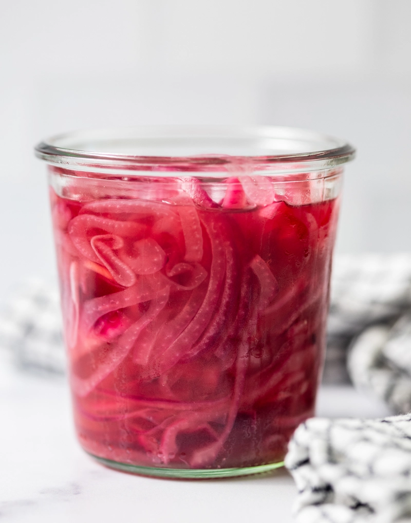 Let the onions cool for a few minutes, then cover and place in the refrigerator for at least an hour. As they sit, the onions and the pickle brine will turn bright pink. You can store the pickles in the fridge and use them for up to two weeks. I am certain you’ll find loads of uses for them!