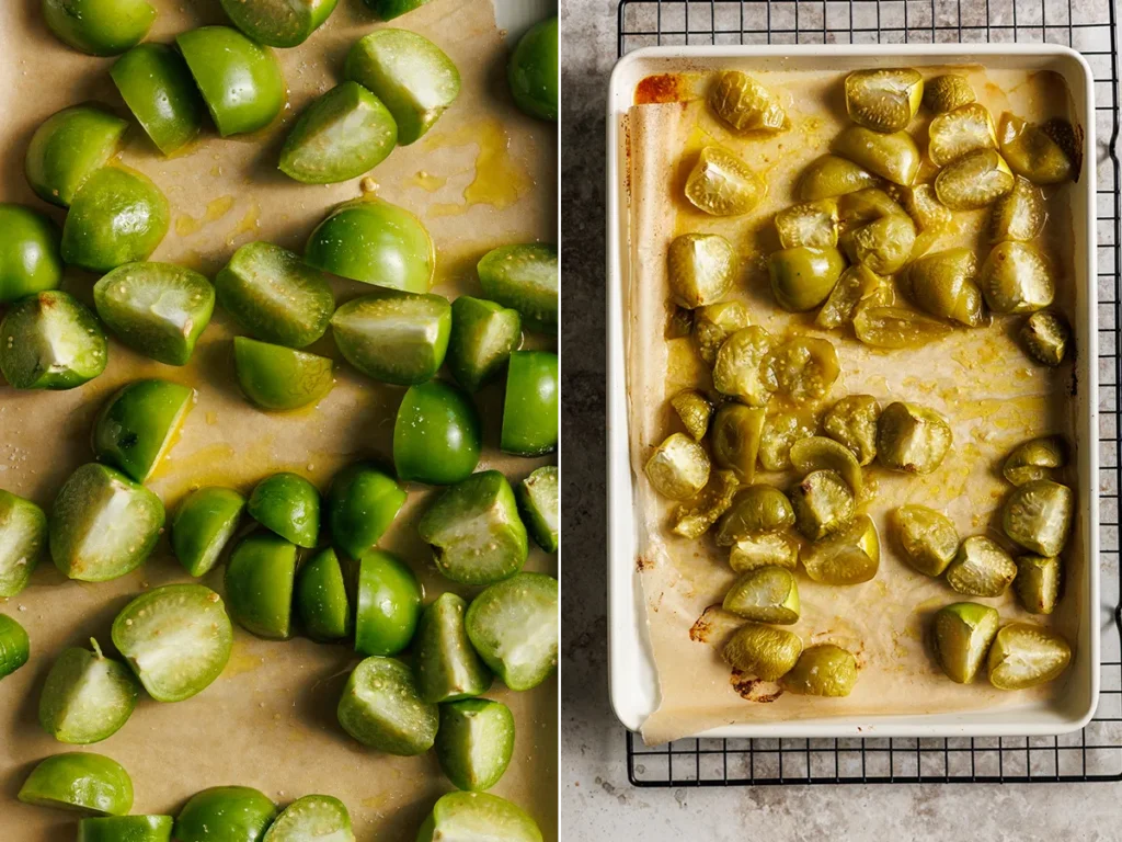 - Husk and rinse the tomatillos to remove their sticky residue, then quarter and toss them with a tablespoon of olive oil or avocado oil and a pinch of salt on a baking sheet. Roast at 425° for about 15 minutes, until soft and lightly browned.
