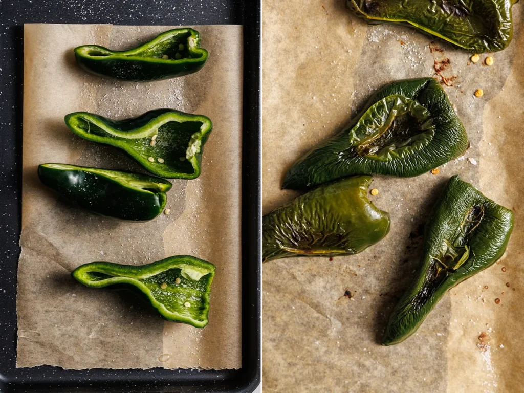 - Meanwhile, halve the poblanos lengthwise, remove the seeds and ribs, and brush them lightly with oil. Season with salt and roast skin-side down on a baking sheet for 15 minutes at 425°, until the skins blister.