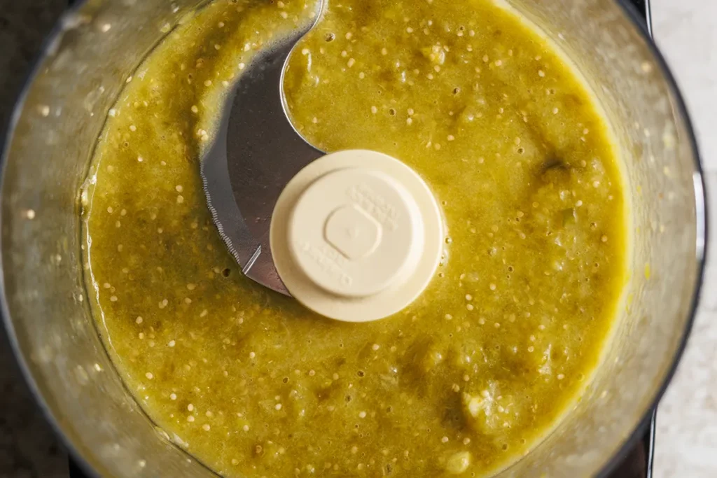 - Transfer the roasted tomatillos and their juices to a food processor and blend until mostly smooth, with some texture remaining. Season to taste.