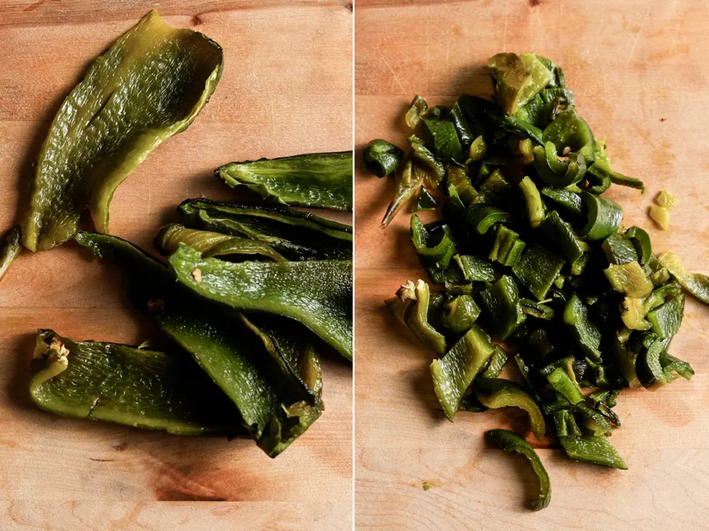 After roasting, the skin of the peppers should be charred and begin to blister. Once they are cool enough to handle, gently peel the skin off, then roughly chop into half-inch pieces.