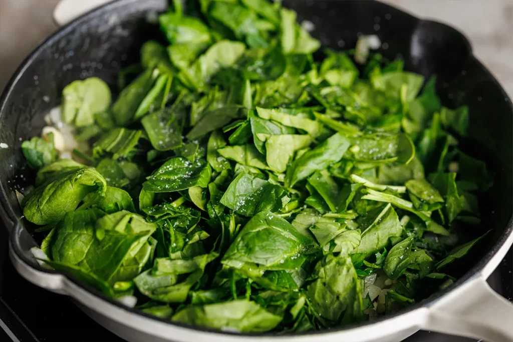 Sauté the onion in a medium skillet with a pinch of salt until it’s translucent. Add the garlic and cook another minute more, then add the spinach with another pinch of salt and cook until it’s just wilted but still bright green.